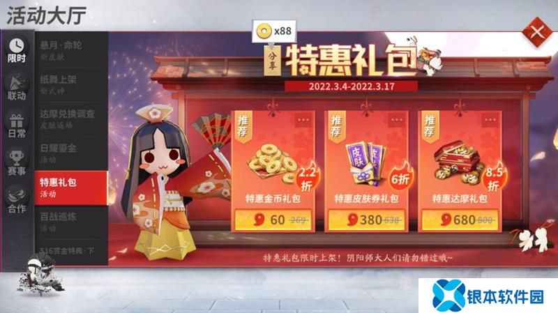 [特惠达摩礼包]、[特惠皮肤券礼包]、[特惠式神与皮肤礼包]限时上架,请勿错过~