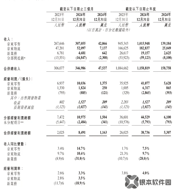 2024年全年,京东收入为11,588亿元人民币,同比增长6.8%;经营利润为387亿元人民币,同比增长48.8%,经营利润率为3.3%;全年归母净利润为414亿元人民币,同比增长71.1%,净利率为3.6%。