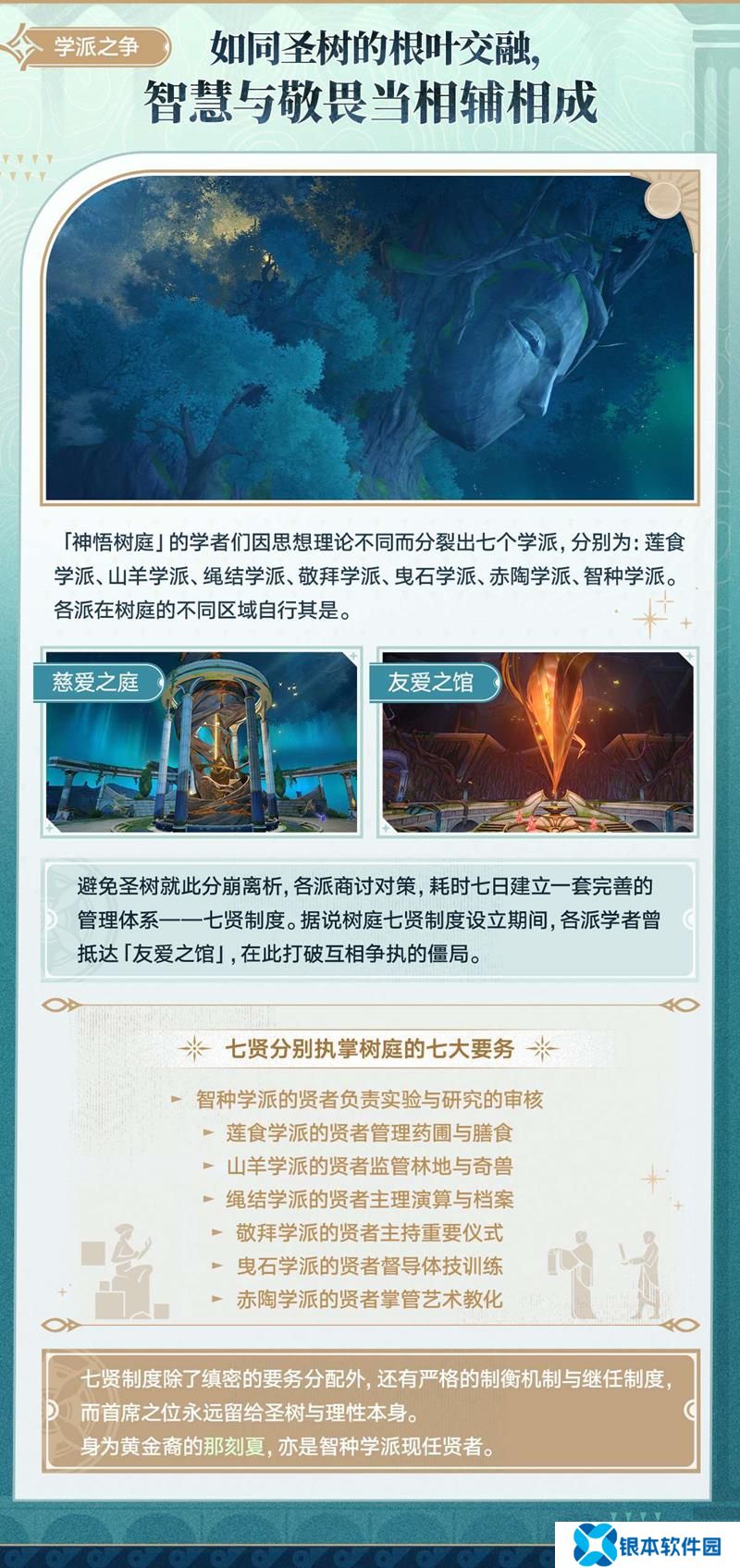 学派之争,如同圣树的根叶交融,智慧与敬畏当相辅相成。「神悟树庭」的学者们因思想理论不同而分裂出七个学派,分别为:莲食学派、山羊学派、绳结学派、敬拜学派、曳石学派、赤陶学派、智种学派。各派在树庭的不同区域自行其是。