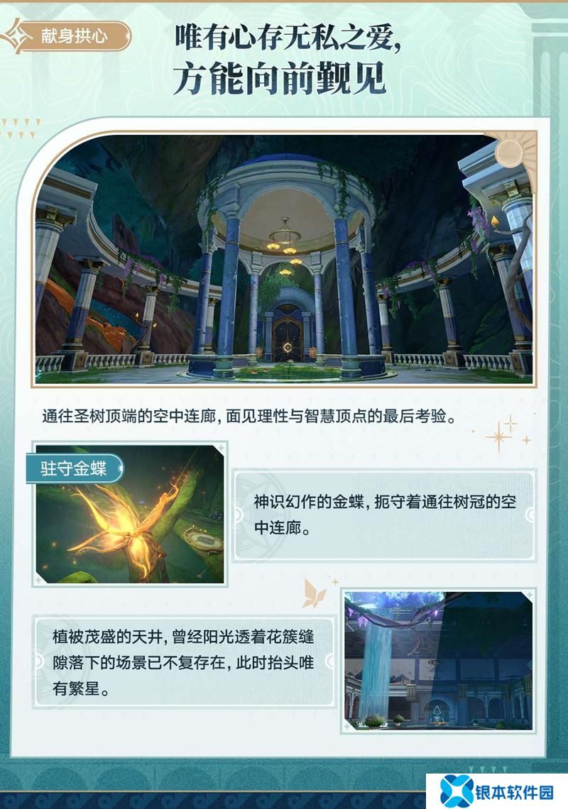 献身拱心,唯有心存无私之爱,方能向前觐见。通往圣树顶端的空中连廊,面见理性与智慧顶点的最后考验。驻守金蝶,神识幻作的金蝶扼守着通往树冠的空中连廊。