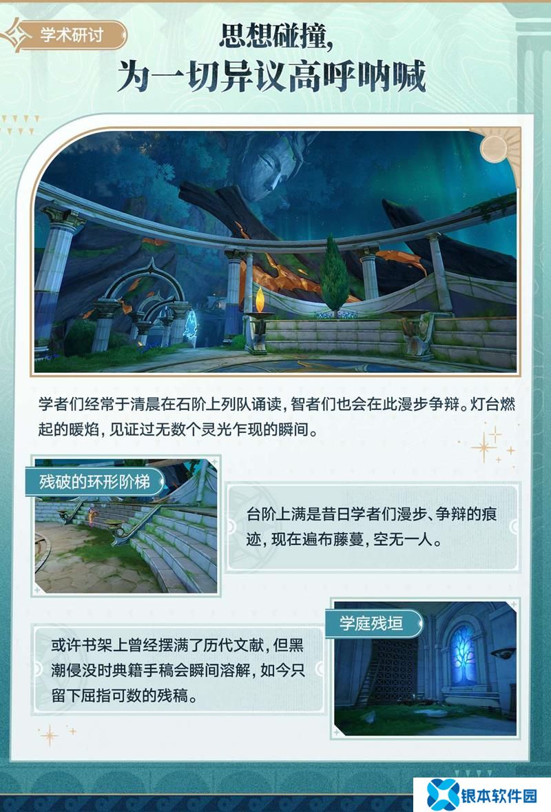 学术研究,思想碰撞,为一切异议高呼呐喊。学者们经常于清晨在石阶上列队诵读,智者们也会在此漫步争辩。灯台燃起的暖焰,见证过无数个灵光乍现的瞬间。残破的环形阶梯,台阶上满是昔日学者们漫步、争辩的痕迹,现在遍布藤蔓,空无一人。学庭残垣或许书架上曾经摆满了历代文献,但黑潮侵没时典籍手稿会瞬间溶解,如今只留下屈指可数的残稿。