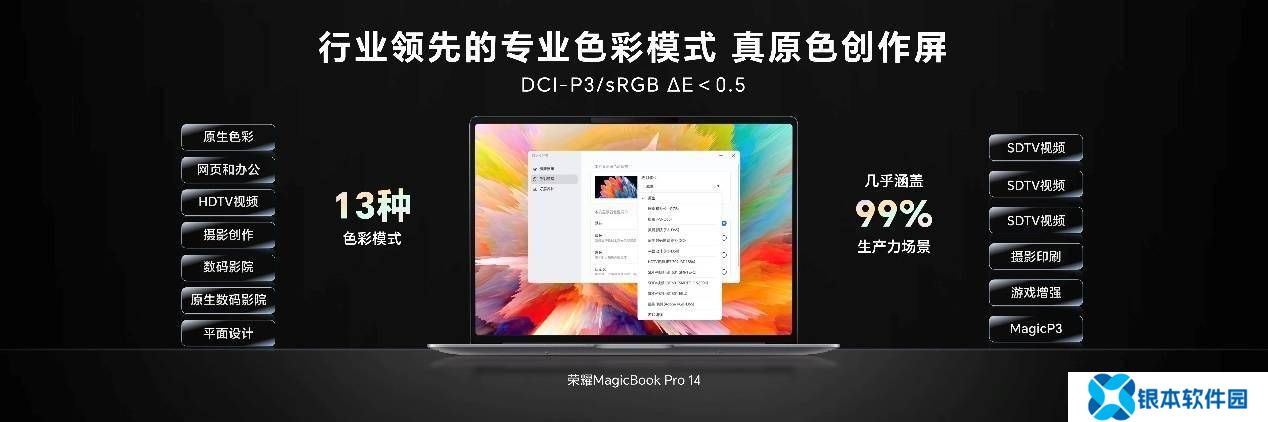 荣耀MagicBook Pro 14配备14.6英寸3120*2080分辨率OLED旗舰级触控好屏,支持多达13种专业色彩模式,可涵盖网页和办公、摄影创作、平面设计等99%的生产力场景,带来极致的真原色创作体验。