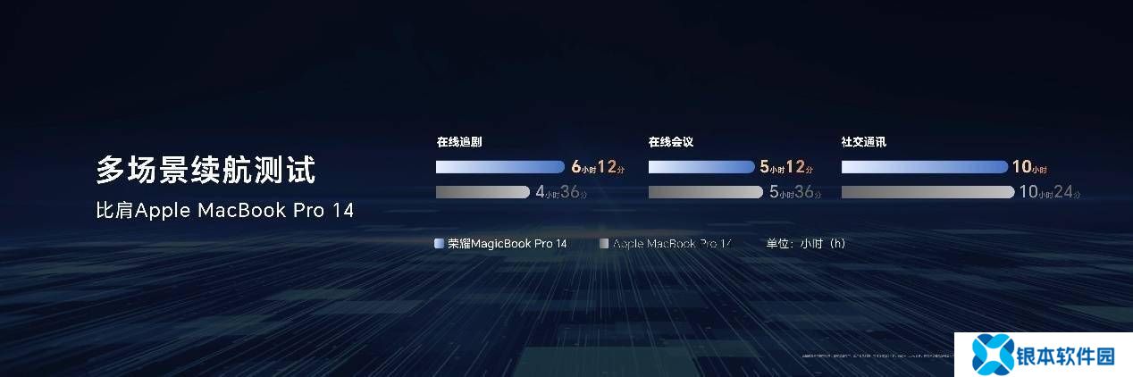 在HonOR Turbo X开启下,荣耀MagicBook Pro 14多场景续航表现为:在线会议5小时12分、在线追剧6小时12分、社交通讯10小时,比肩苹果MacBook Pro 14(M4 Pro),首次见证x86笔记本续航里程碑时刻。