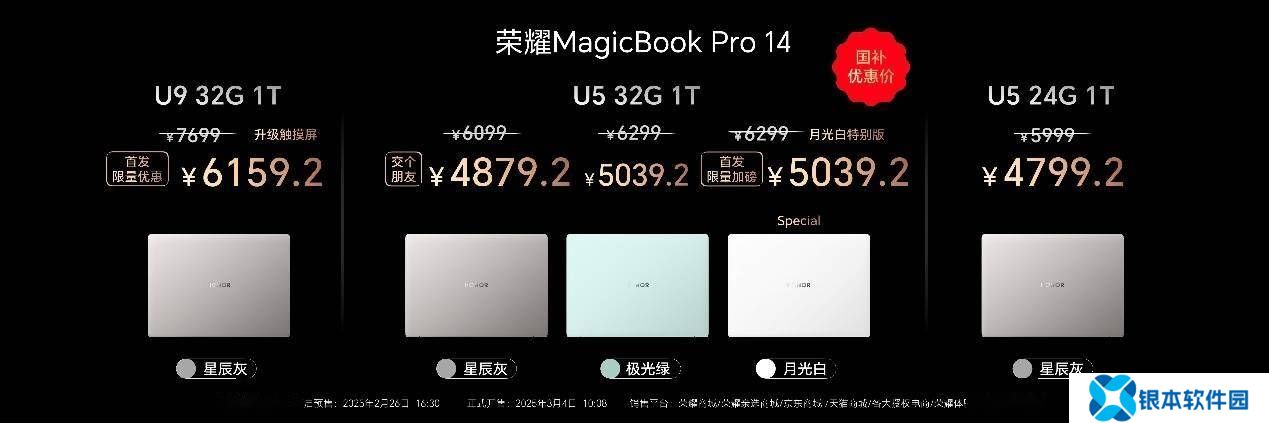 荣耀MagicBook Pro 14为消费者提供多种配置选择,Ultra5+24GB+1TB国补到手价4799.2元,Ultra5+32GB+1TB国补到手价4879.2元,Ultra9+32GB+1TB触控屏版到国补手价6159.2元,于2月26日16:30开启预售,3月4日10:08正式开售。