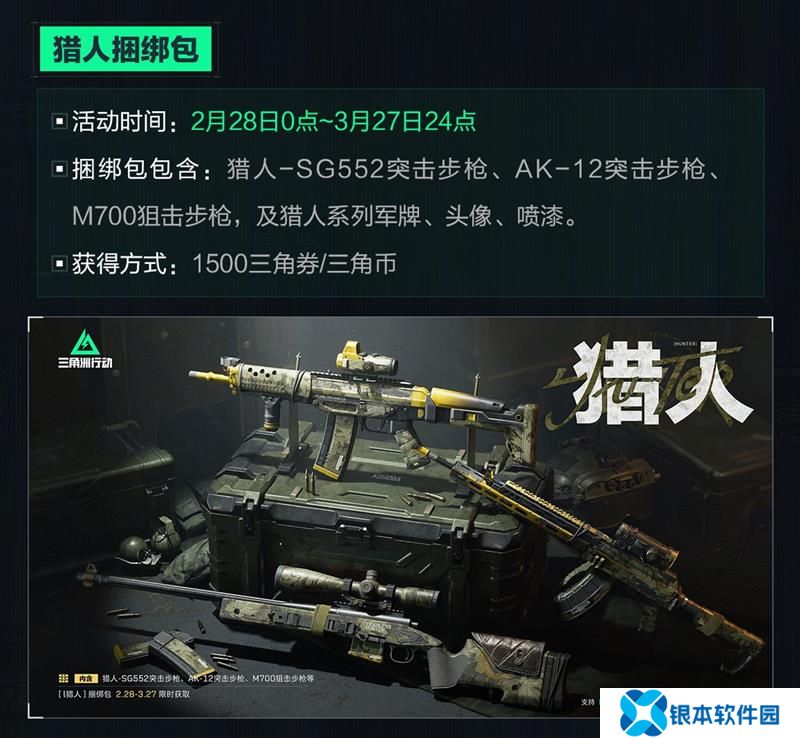 捆绑包包含:猎人-SG552突击步枪、AK-12突击步枪、M700狙击步枪,及猎人系列军牌、头像、喷漆。