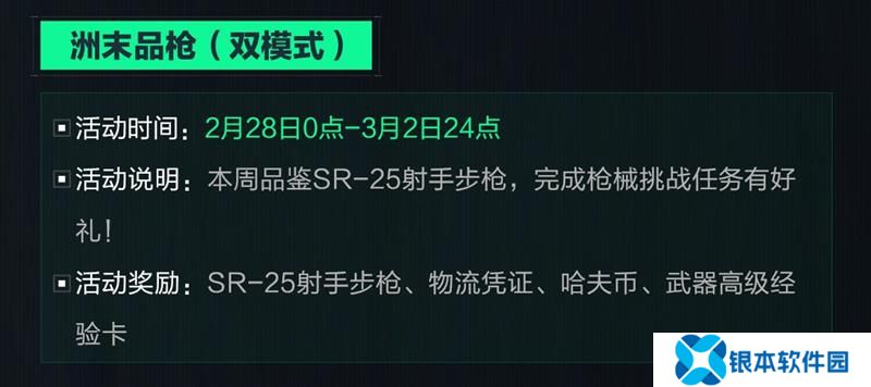 活动说明:本周品鉴SR-25射手步枪,完成枪械挑战任务有好礼!
