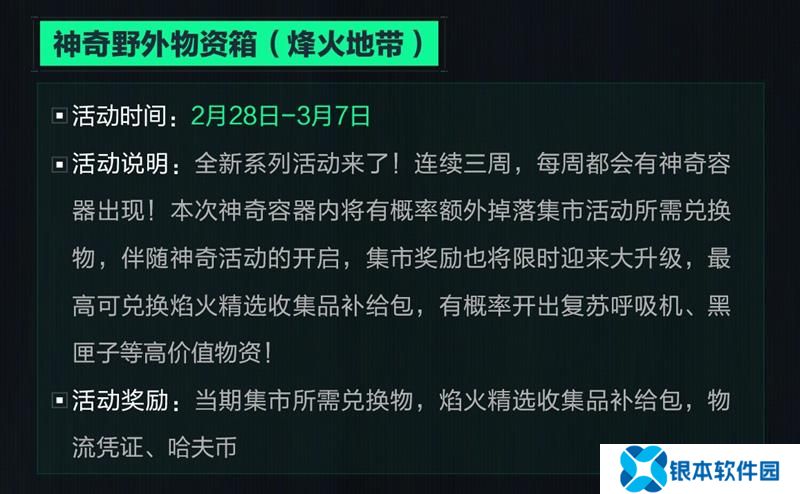活动说明:全新系列活动来了!连续三周,每周都会有神奇容器出现!本次神奇容器内将有概率额外掉落集市活动所需兑换物,伴随神奇活动的开启,集市奖励也将限时迎来大升级,最高可兑换焰火精选收集品补给包,有概率开出复苏呼吸机、黑匣子等高价值物资!