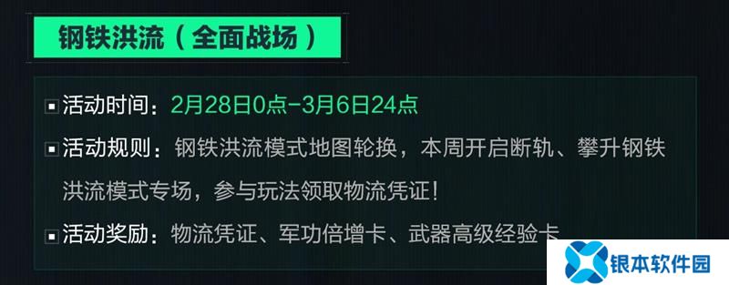 活动规则:钢铁洪流模式地图轮换,本周开启断轨、攀升钢铁洪流模式专场,参与玩法领取物流凭证!