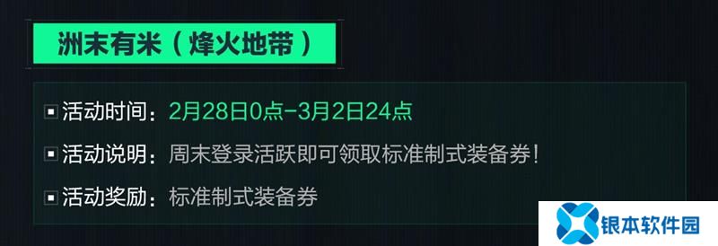 活动说明:周末登录活跃即可领取标准制式装备券!