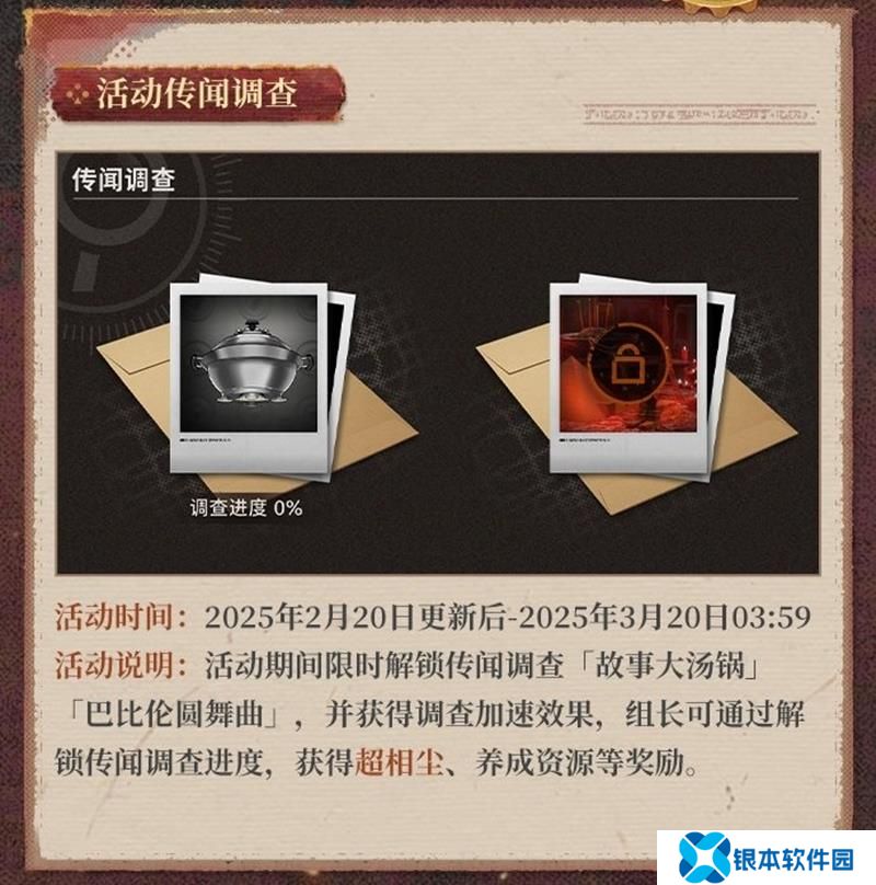 活动传闻调查活动时间:2025年2月20日更新后-2025年3月20日03:59活动说明:活动期间限时解锁传闻调查「故事大汤锅」「巴比伦圆舞曲」,并获得调查加速效果,组长可通过解锁传闻调查进度,获得超相尘、养成资源等奖励。