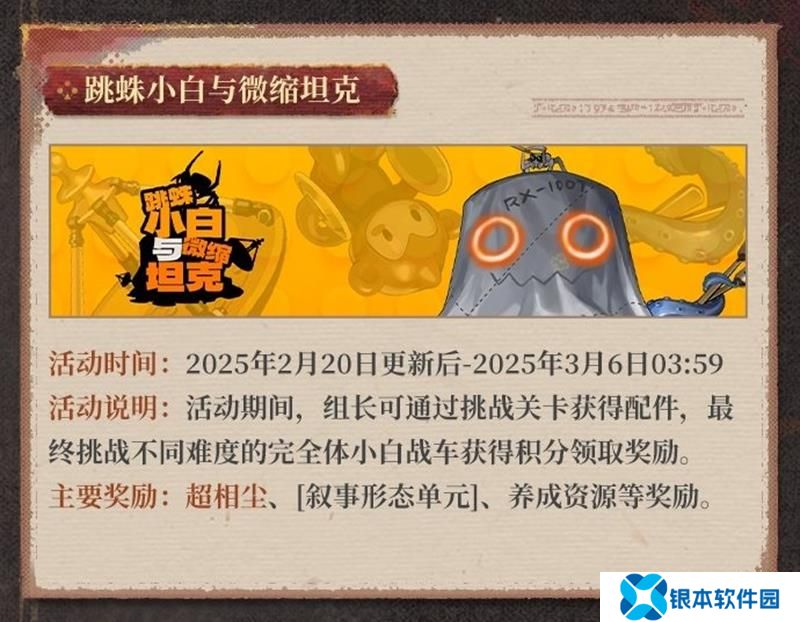 跳蛛小白与微缩坦克活动时间:2025年2月20日更新后-2025年3月6日03:59活动说明:活动期间,组长可通过挑战关卡获得配件,最终挑战不同难度的完全体小白战车获取积分领取奖励。主要奖励:超相尘、【叙事形态单元】、养成资源等奖励