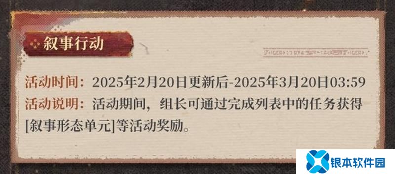 叙事行动活动时间:2025年2月20日更新后-2025年3月20日03:59活动说明:活动期间,组长可通过完成书中的任务获取【叙事形态单元】等活动奖励。