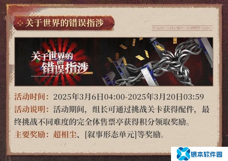 关于世界的错误指引活动时间:2025年3月6日04:00-2025年3月20日03:59活动说明:活动期间,组长可通过挑战关卡获得配件,最终挑战不同难度的完全体售票亭获得积分领取奖励。主要奖励:超相尘、【叙事形态单元】等奖励