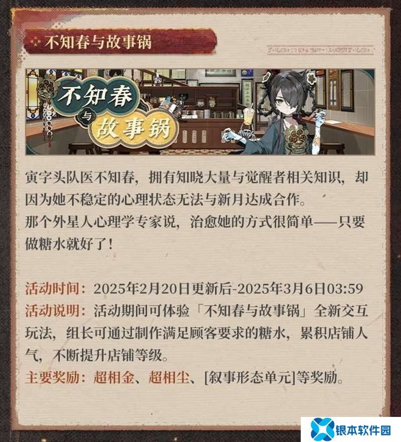 不知春与故事锅活动时间:2025年2月20日更新后-2025年3月6日03:59活动说明:活动期间可体验不知春与故事锅全新交互玩法,组长可通过制作满足顾客要求的糖水,累积店铺人气,不断提升店铺等级。主要奖励:超相金、超相尘、【叙事形态单元】等奖励