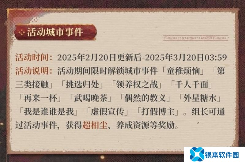 活动城市事件活动时间:2025年2月20日更新后-2025年3月20日03:59活动说明:活动期间限时解锁城市事件「童稚烦恼」「第一类接触」「挑选归处」「领养权之战」「千人千面」「再来一杯」「武喝晚茶」「偶然的教义」「外星糖水」「我是谁谁是我」「虚假宣传」「打假博主」等活动事件,获得超相尘、养成资源等奖励。