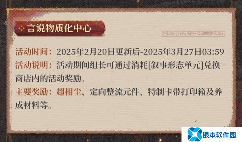 言说物质化中心活动时间:2025年2月20日更新后-2025年3月27日03:59活动说明:活动期间组长可通过消耗【叙事形态单元】兑换店内的活动奖励。主要奖励:超相金、定向向量整流元件、特制卡带打印箱及养柠乐章收集