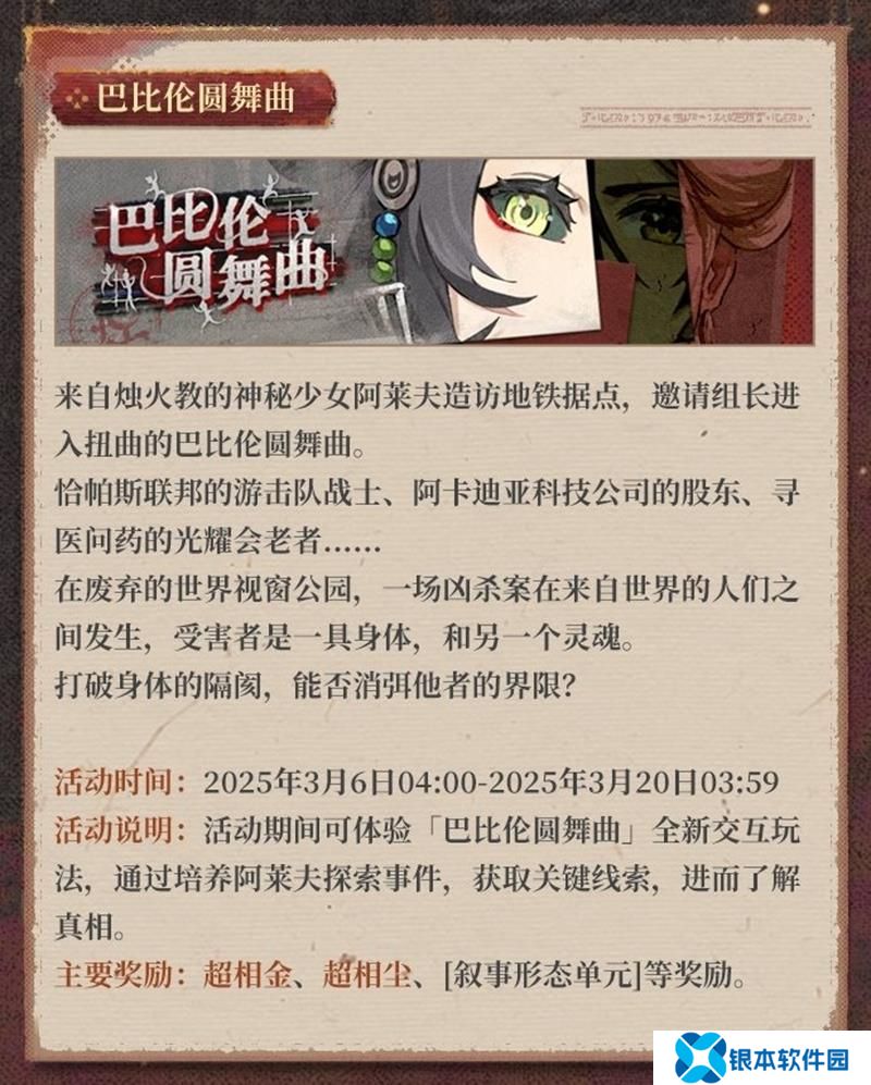 巴比伦圆舞曲活动时间:2025年3月6日04:00-2025年3月20日03:59活动说明:活动期间可体验巴比伦圆舞曲全新交互玩法,通过培养阿莱夫探索事件,获取关键线索,进而解开谜题。主要奖励:超相金、超相尘、【叙事形态单元】等奖励
