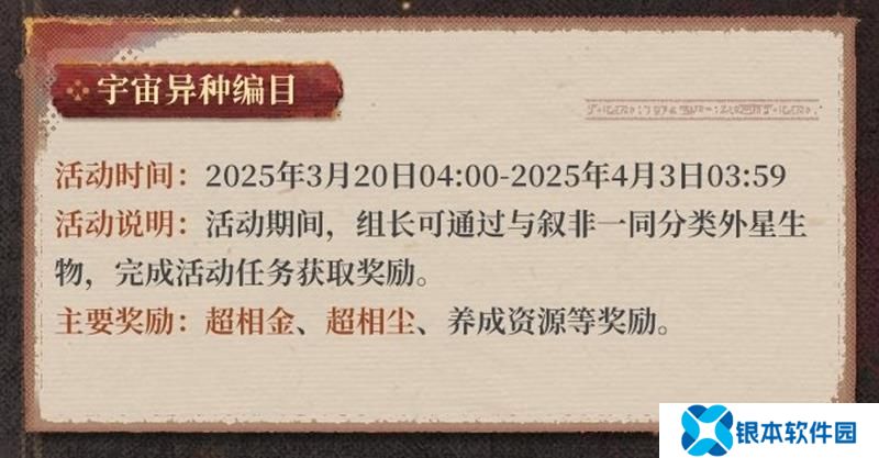 宇宙异种编目活动时间:2025年3月20日04:00-2025年4月3日03:59活动说明:活动期间,组长可通过与叙非一同分类外星生物,完成活动任务获取奖励。主要奖励:超相金、超相尘、养成资源等奖励