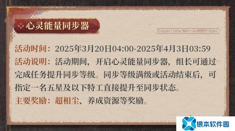 灵能量同步器活动时间:2025年3月20日04:00-2025年4月3日03:59活动说明:活动期间,开启心灵能量同步器。组长可通过完成任务提升同步等级。同步等级满级或活动结束后,可指定一名五星及以下特工直接提升至同步状态。主要奖励:超相金、养成资源等奖励