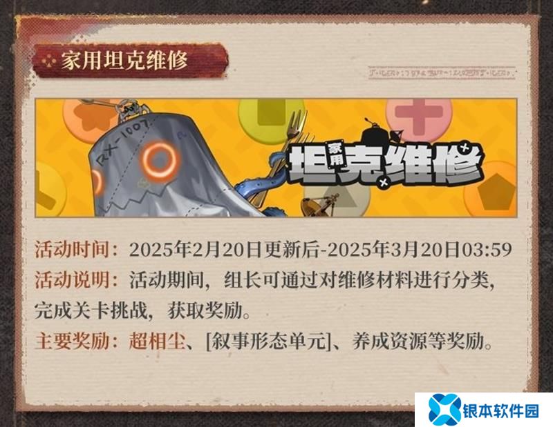 家用坦克维修活动时间:2025年2月20日更新后-2025年3月20日03:59活动说明:活动期间,组长可通过对维修材料进行分类,完成关卡挑战,获取奖励。主要奖励:超相尘、【叙事形态单元】、养成资源等奖励