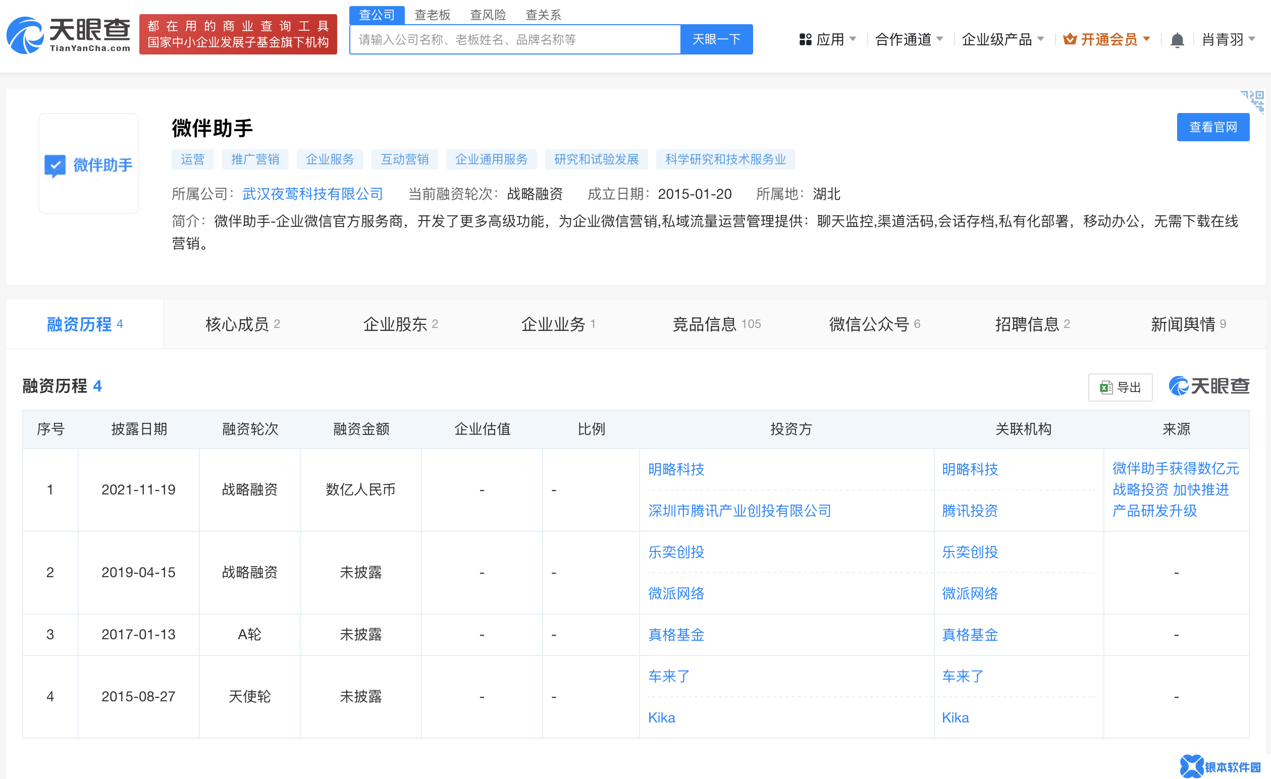 此外,肖弘名下还曾关联1家武汉夜莺科技有限公司,其于2024年12月退出该公司股东,融资历史显示,该公司获得4轮融资,投资方包括腾讯、真格基金、明略科技等。