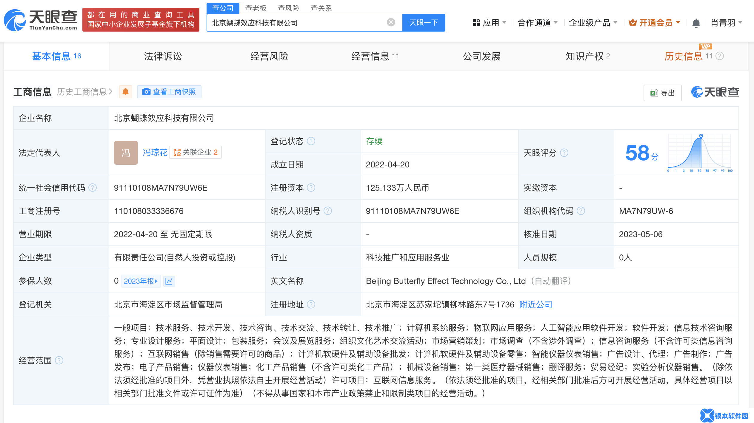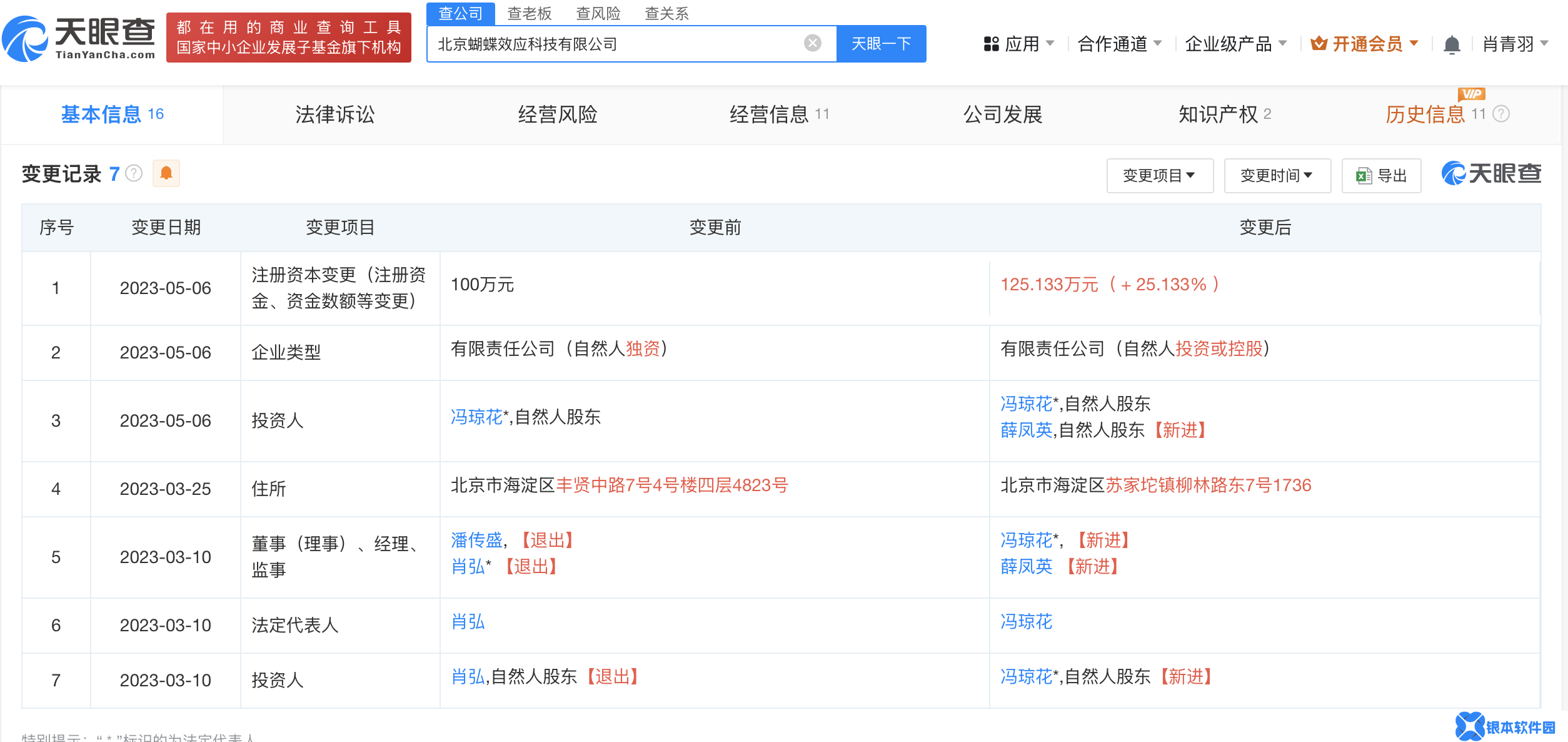 天眼查App显示,Monica关联北京红色蝴蝶科技有限公司成立于2023年7月,法定代表人为冯琼花,由Butterfly Effect (Hong Kong) Limited全资持股。Monica运营方北京蝴蝶效应科技有限公司成立于2022年4月,由冯琼花、薛凤英共同持股。变更记录显示,肖弘于2023年3月退出该公司股东。