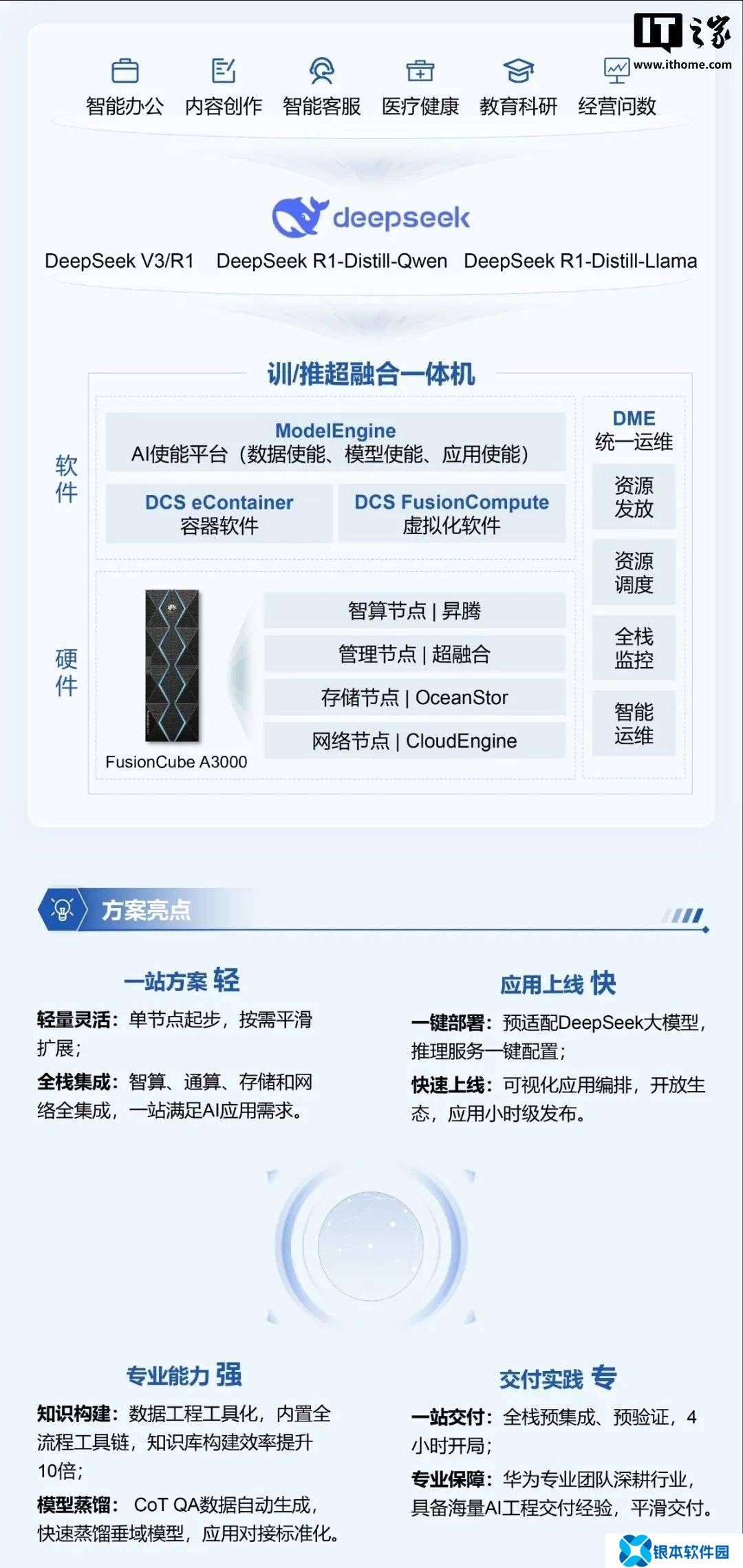 华为近期推出了针对DeepSeek的DCS AI解决方案,该方案的核心是一体化的FusionCube A3000训练与推理超融合设备。这款设备特别适配DeepSeek V3和R1版本以及蒸馏模型,并支持企业的私有化部署需求。