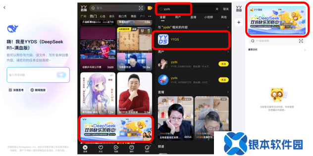 目前,用户只需通过YY直播App、YY语音App以及PC客户端的多个入口,即可轻松体验YYDS带来的纯享版DeepSeek功能。无论是通过图片推荐位、手动搜索“YYDS”,还是点击直播间内的活动提示条,用户都能轻松进入产品页面,享受AI技术的便捷与乐趣。