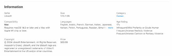 苹果AppStore商店列出了《刺客信条:影》的容量大小,Mac版为123.2G,玩家可使用macOS 14.0或更高版本且配Apple M1芯片或以上的游玩本作。