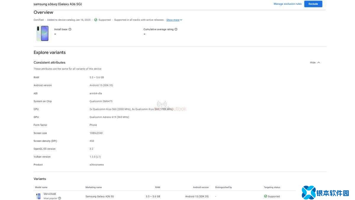 接下来是Galaxy A36 5G,型号SM-A366B。该机型将配备6GB RAM,同样预装Android 15操作系统,搭载高通骁龙6 Gen 3芯片和Adreno 619 GPU,屏幕分辨率为1080 x 2340。设计方面,Galaxy A36 5G采用居中打孔屏,后盖扁平,摄像头模组以垂直排列的药丸状呈现,并配备侧面按键。目前,该机型已获得FCC、TUV Rheinland和GCF等认证,Geekbench跑分和法国支持页面也已曝光,预计将于2025年3月中旬正式发布。