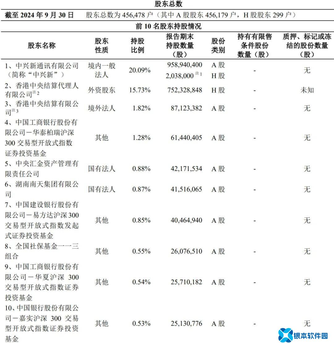 截至2024年9月30日,中兴新通讯有限公司持股20.09%,香港中央结算代理人有限公司持股为15.73%,香港中央结算有限公司持股为1.82%,中国工商银行股份有限公司-华泰柏瑞沪深300交易型开放式指数证券投资基金持股为1.28%;