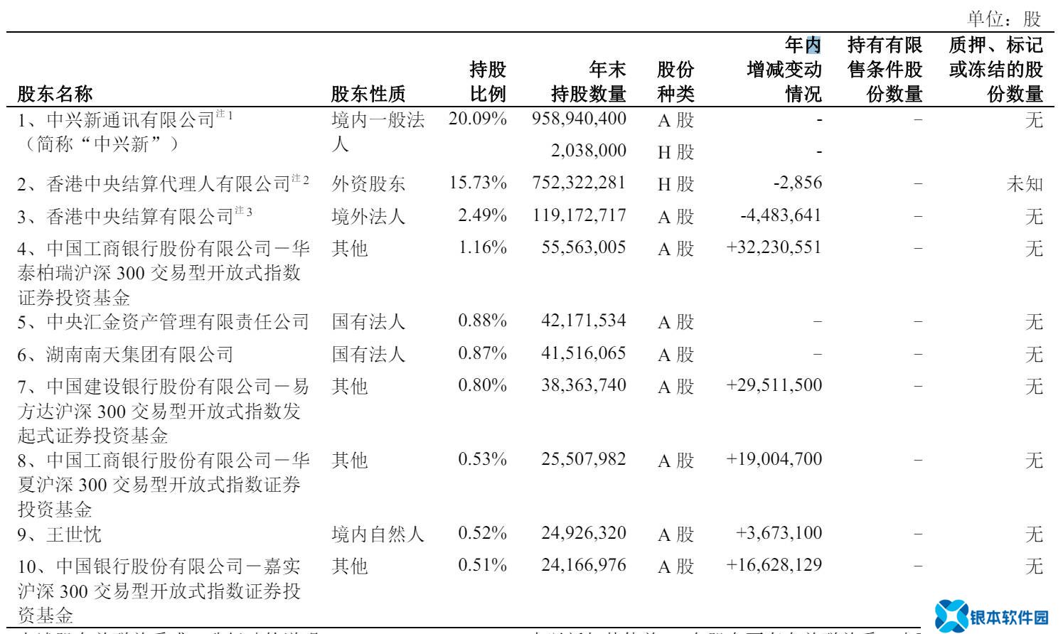截至2024年12月31日,中兴新通讯有限公司持股20.09%,香港中央结算代理人有限公司持股为15.73%,香港中央结算有限公司持股为2.49%,中国工商银行股份有限公司-华泰柏瑞沪深300交易型开放式指数证券投资基金持股为1.16%;