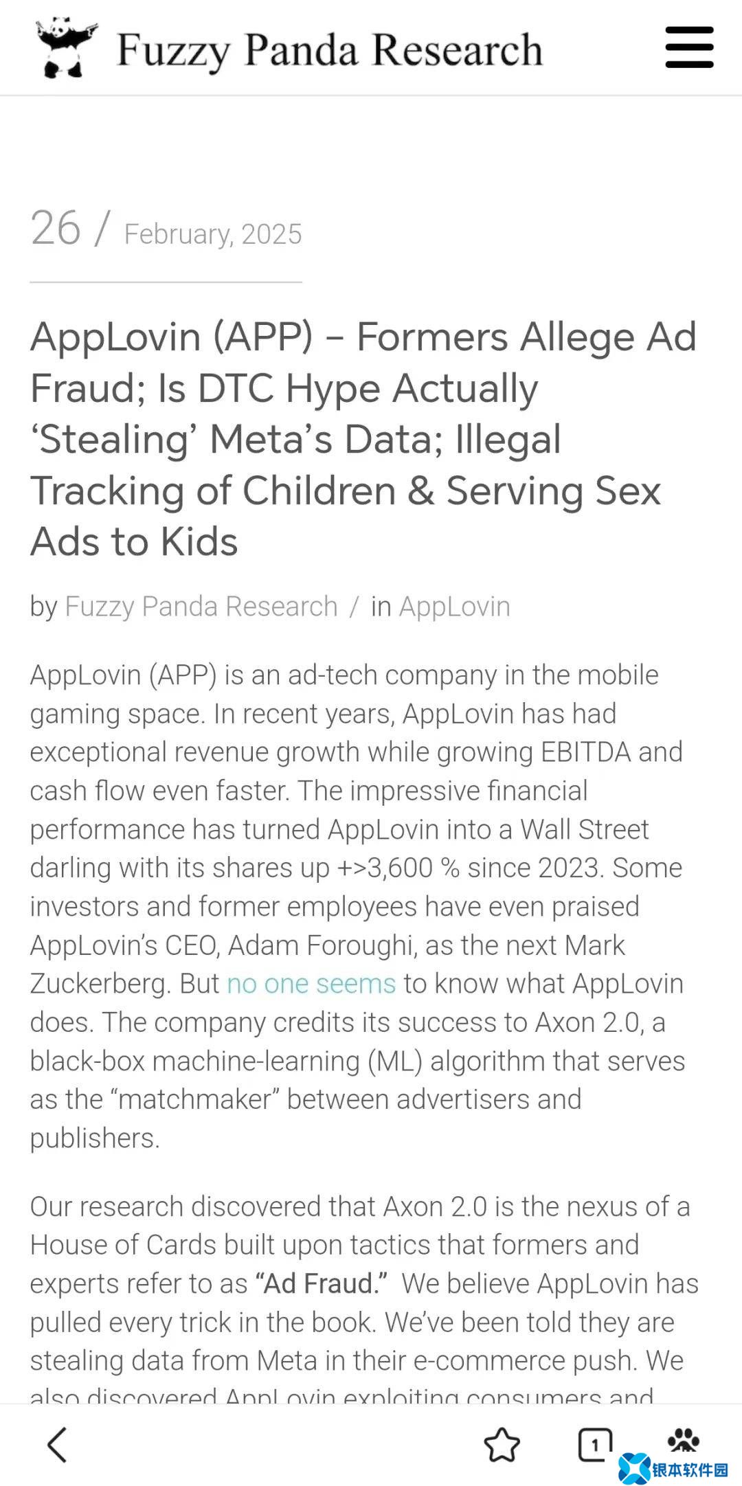 Fuzzy Panda Research认为,AppLovin发布的产品Axon 2.0是一个建立在欺诈手段上的“纸牌屋”核心。前员工和专家称这些手段为“广告欺诈”。报告称相信AppLovin已用尽所有花招:在电商业务中窃取meta数据;以明显违反谷歌和苹果应用商店政策的方式滥用消费者数据。