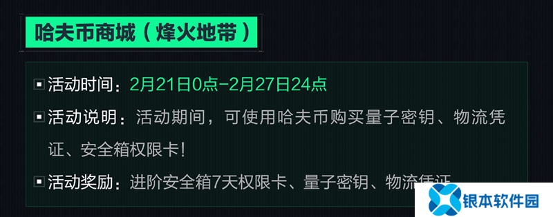 活动说明:活动期间,可使用哈夫币购买量子密钥、物流凭证、安全箱权限卡