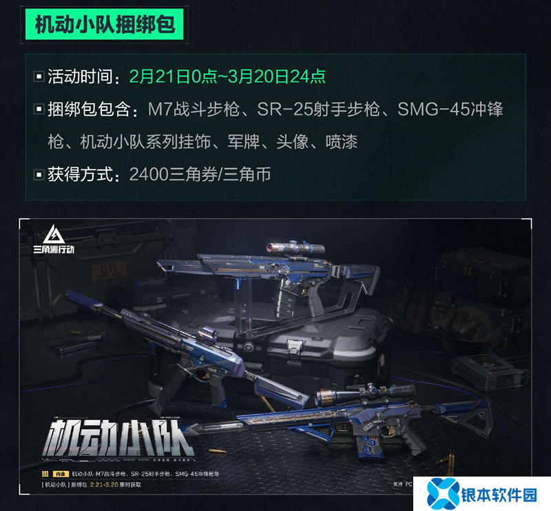 捆绑包包含: M7战斗步枪、SR-25射手步枪、SMG-45冲锋枪、机动小队系列挂饰、军牌、头像、喷漆