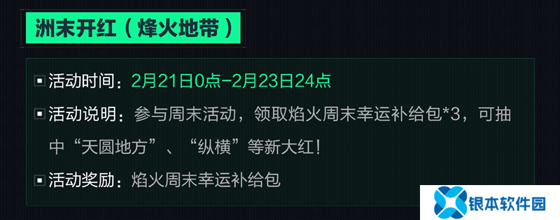 活动说明: 参与周末活动,领取焰火周末幸运补给包*3,可抽中“天圆地方”、“纵横”等新大红!