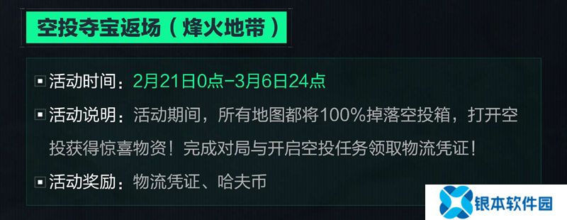 活动说明: 活动期间,所有地图都将100%掉落空投箱,打开空投获得惊喜物资!完成对局与开启空投任务领取物流凭证!