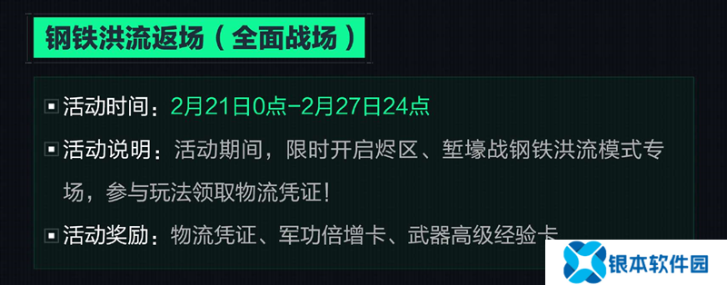 活动说明: 活动期间,限时开启烬区、堑壕战钢铁洪流模式专场,参与玩法领取物流凭证!