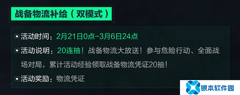 活动说明: 20连抽!战备物流大放送参与危险行动、全面战场对局,累计活动经验领取战备物流凭证20抽!