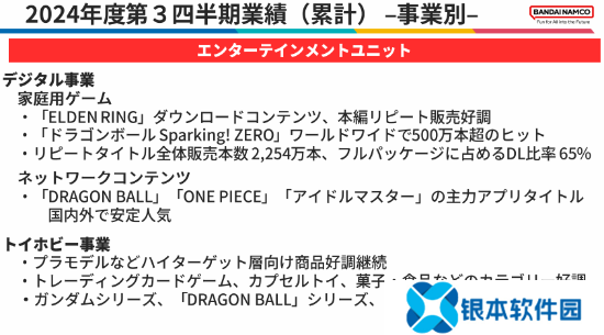 万代南梦宫公开了2024至2025财年Q3财报,创历史最佳业绩,其中艾尔登法环销量强劲,同时七龙珠电光炸裂也做出了不俗贡献。我们来一起看看具体内容吧!