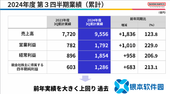 就在今日,万代南梦宫公开了2024至2025财年Q3财报。其中可以看到,该财年销售额为9556亿日元(大约为人民币453.6亿元),同比增长23.8%;营业利润1792亿日元(大约为人民币85亿元),同比增长129%;经常利益1854亿日元(大约为人民币88亿元),同比增长106.9%,创下历史最好业绩!