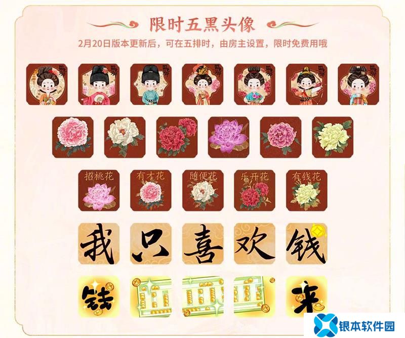 五黑头像免费用:2月20日版本更新后,国色芳华同款五黑头像,可在五排时由房主设置,限时免费使用。