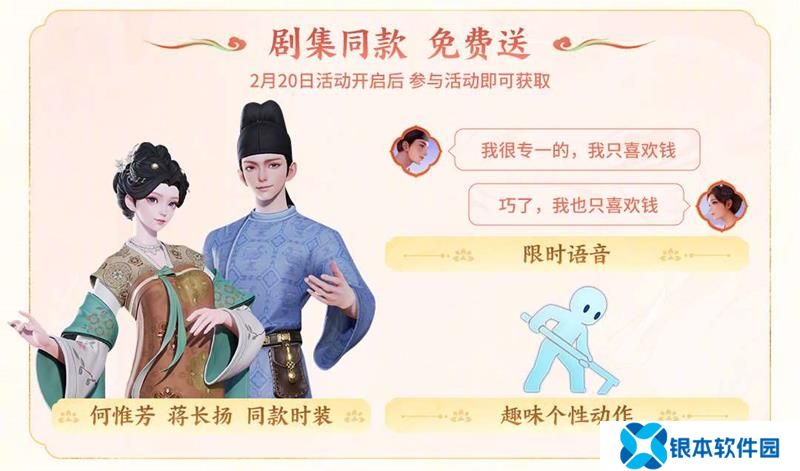 剧集同款免费送:2月20日活动开启后,参与活动即可免费获取何惟芳/蒋长扬同款时装、国色芳华同款限时语音、趣味个性动作。