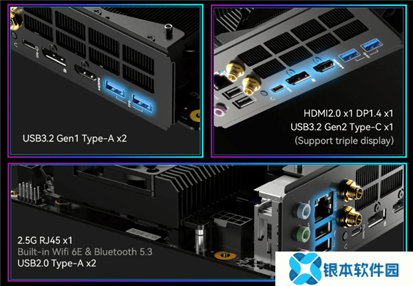 同时,其配有双SO-DIMM插槽,支持DDR5-5200内存,最大容量96GB;提供1条PCIe 5.0 x16的显卡插槽;双PCIe 5.0 x4规格的M.2 2280插槽;带有支持Wi-Fi无线网卡的M.2 2230插槽,支持Wi-Fi 6E和蓝牙5.3。