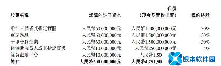 注意到,吉利集团、重庆迈驰、千里合伙企业、路特斯机器人及雇员激励平台在完成交割后将分别拥有合资公司的 30%、30%、30%、5% 及 5% 的权益。