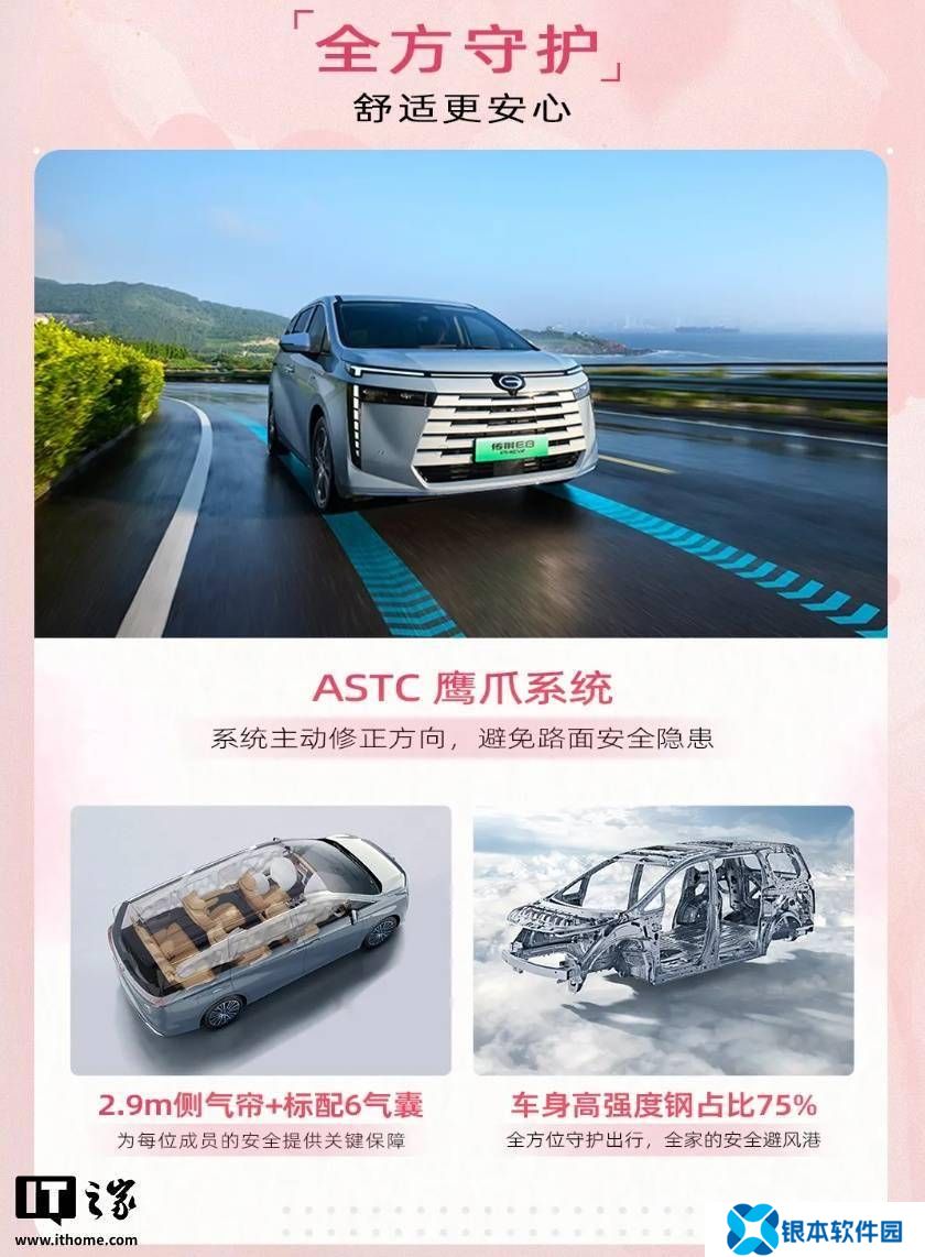 在智能化方面,广汽传祺E8 PRO+ MPV采用了高通骁龙8155车机芯片,并支持定速巡航功能。车辆还配备了540°高清全景影像系统,包含透明底盘功能,提升了驾驶安全性。车身方面,高强度钢占比达到75%,并配备了ASTC鹰爪系统,可以主动修正方向。新车还标配了6气囊,前排座椅支持电动调节、通风和加热功能。
