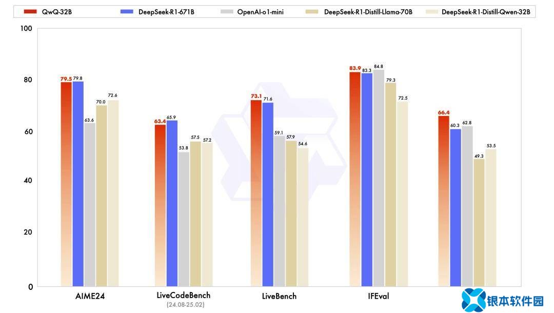 在测试数学能力的 AIME24 评测集上,以及评估代码能力的 LiveCodeBench 中, 千问 QwQ-32B 表现与 DeepSeek-R1 相当,远胜于 o1-mini 及相同尺寸的 R1 蒸馏模型。