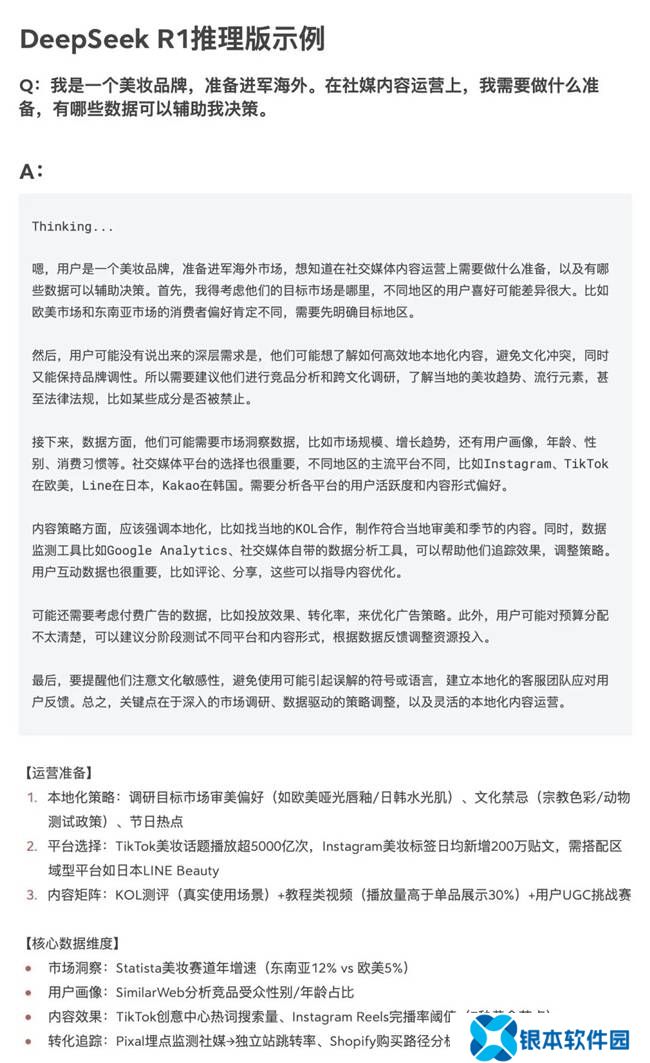 以美妆品牌进军海外的营销场景为例,当用户输入询问如何在社交媒体内容运营上做好准备,以及哪些数据可以辅助决策时,DeepSeek模型迅速给出了详尽的解答。这不仅展示了模型在复杂问题处理上的能力,也体现了其在行业应用中的实用性。