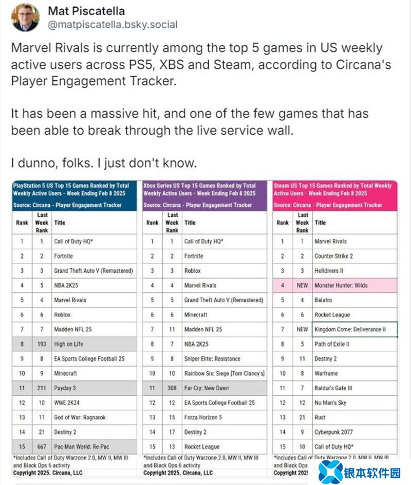 尽管如此,裁员消息还是令人意外,因为《漫威争锋》自 12 月发布以来,在 Steam 上一直保持着高玩家数量。Circana 分析师 Mat Piscatella 周二表示,《漫威争锋》目前在美国 PS5、Xbox 和 Steam 平台的周活跃用户中排名前五。“这款游戏取得了巨大成功,是少数能够突破在线服务壁垒的游戏之一,”他写道,“我不知道,伙计们,我真的不知道。”