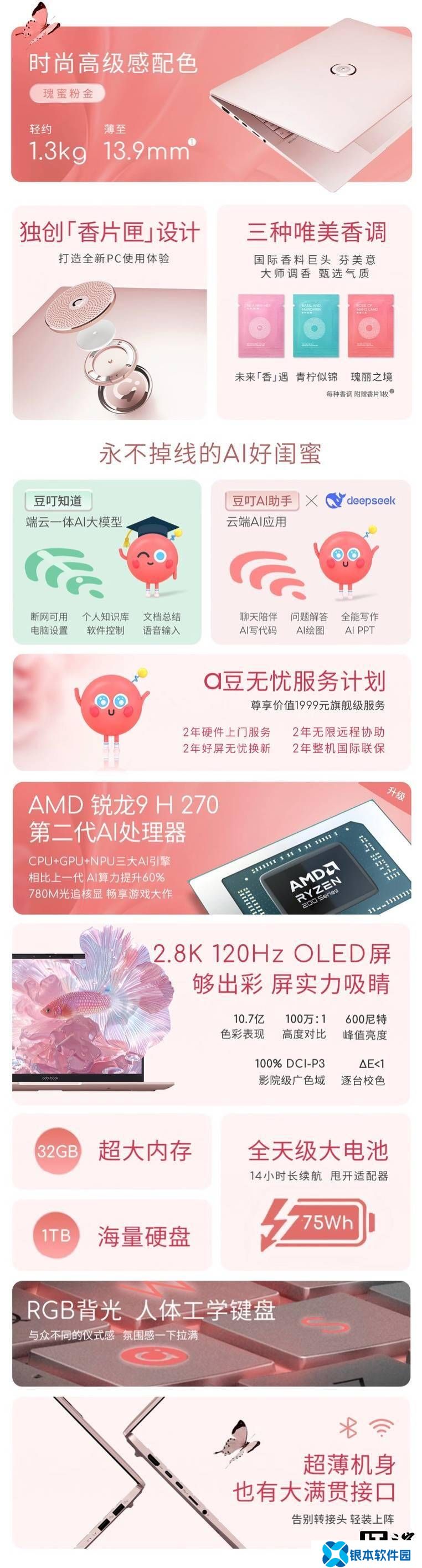 获悉,这款笔记本采用粉色外观,整体重量 1.29 千克,厚度 13.9 毫米,主打“香片匣”设计,用户可以为笔记本安装香片(可选三种气味),从而能够让笔记本散发出香味;其内置 75Wh 电池,至高可连续播放 17 小时视频。
